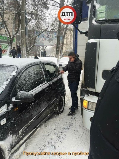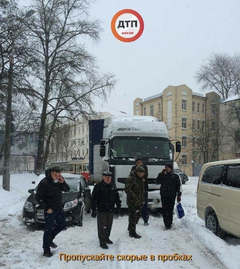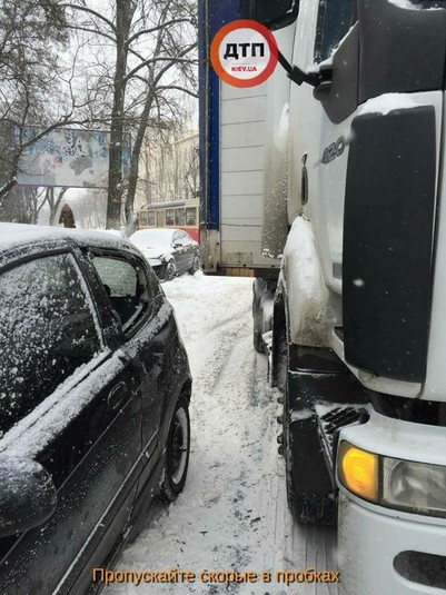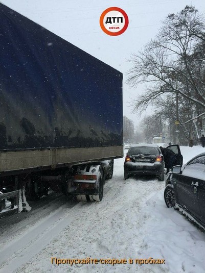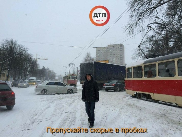 Як повідомляв «Главком», через сильний снігопад на в’їздах до столиці вранці утворилися величезні затори. У столиці зупинився рух на лінії швидкісного трамвая. На Святошино сталася масштабна ДТП.