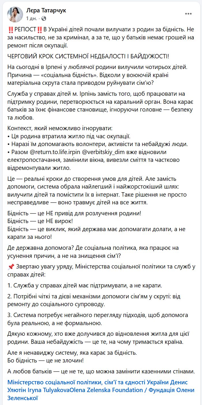 «Але замість допомоги, система обрала найлегший і найжорстокіший шлях: вилучити дітей та помістити їх в інтернат. Таке рішення не просто несправедливе – воно травмує дітей на все життя. Бідність – це не привід для розлучення родини! Бідність – це не вирок! Бідність – це виклик, який держава має допомагати долати, а не карати за нього», – наголошує Татарчук.