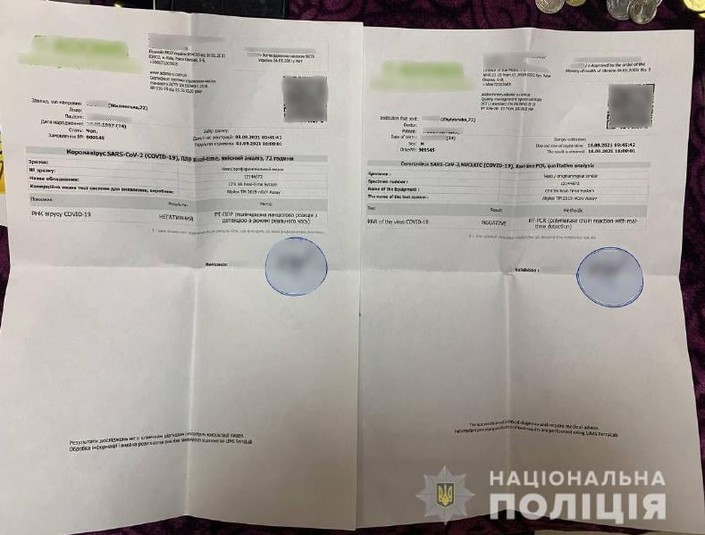 В оселі фігурантів та в їхній автівці правоохоронці провели обшуки із залученням полку поліції особливого призначення. За результатами вилучено ноутбук, мобільні телефони, банківські картки, а також бланки для ПЛР-тестів на коронавірус. У результаті огляду вилученої техніки, знайдено листування про замовлення підроблених сертифікатів та виявлено бланки для їхнього виготовлення.