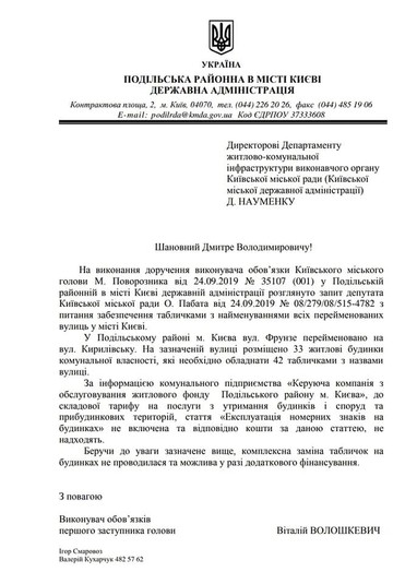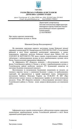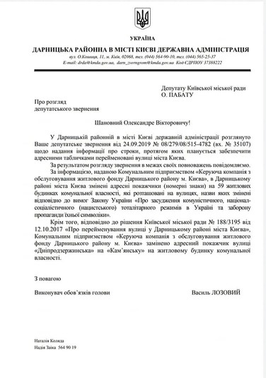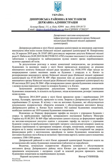 Деснянська райдержадміністрація повідомила, що всі будинкові покажчики, які необхідно було замінити, замінені.
