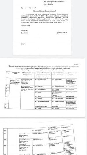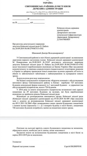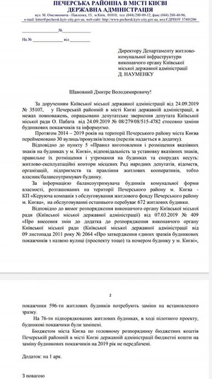 Як повідомляється в офіційних відповідях райдержадміністрацій у Києві на запити Пабата, у Дніпровському районі необхідно замінити 1019 домових покажчиків, у Святошинському районі заміни потребують 726 покажчиків, в Печерському районі - 596.