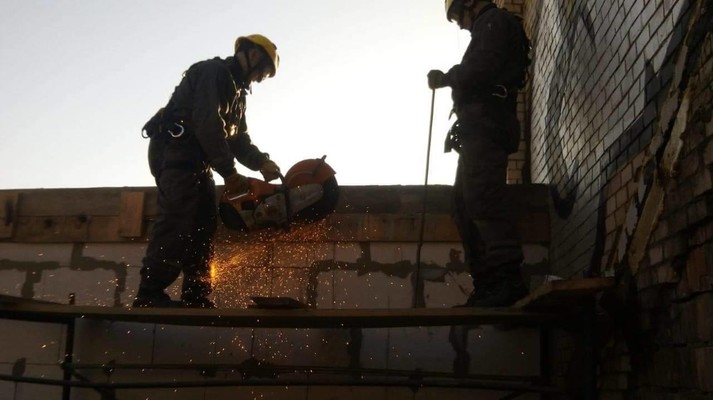 Бригада демонтує бетонні блоки за допомогою лебідок та крану