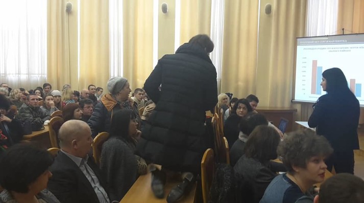 «Люди, що вдерлися до Печерської РДА, так хотіли почути звіт голови, що фактично зірвали його. Перекрикували мікрофон, гамселилися в проходах», - йдеться у повідомленні.