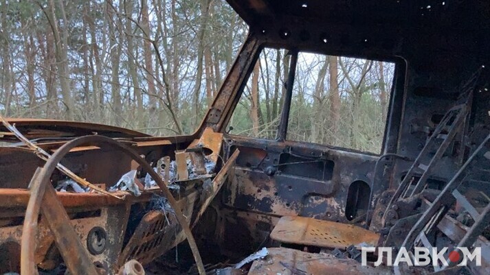 Зустрічаються танки та автомобілі, запчастини яких розкидані узбіччям внаслідок потужного вибуху.