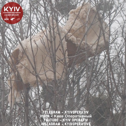 Так, біля п’ятого під’їзду будинку на Дегтярівській, 6 (зі сторони трамвайних колій) на рівні п’ятого поверху на каштані під самим вікнами будинку з‘явився фрагмент дивану з дошкою та обшивкою. Орієнтовний розмір фрагмента дивана: довжина 2 метри, ширина 1,5 метра.