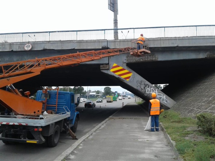 У Києві на шляхопроводі на перетині вул. Миропільської з Броварським проспектом і Святошинсько-Броварською лінією метрополітену біля станції «Чернігівська» дорожники провели «косметичний ремонт» споруди.