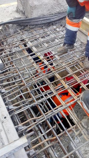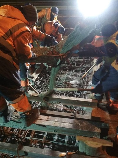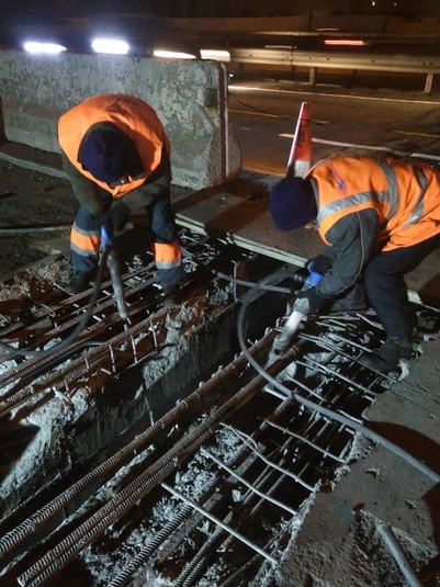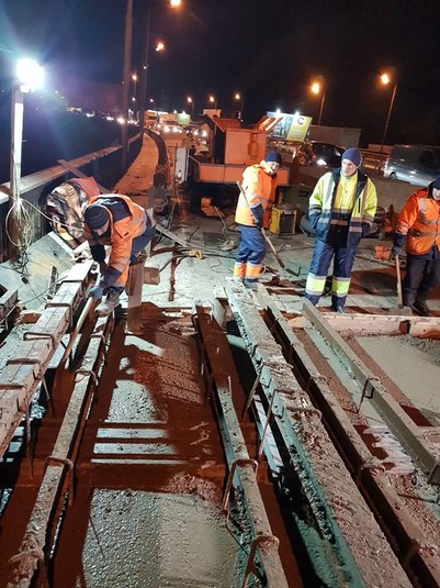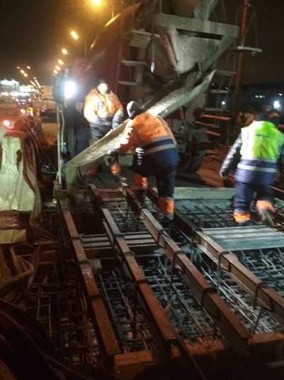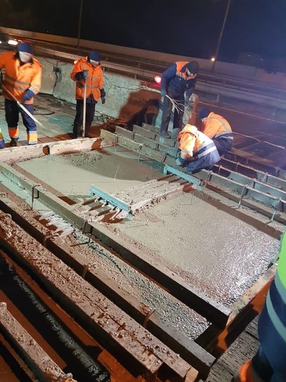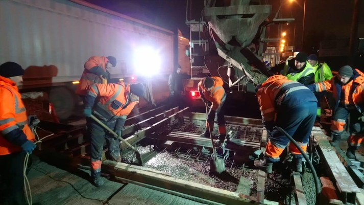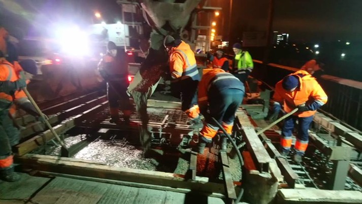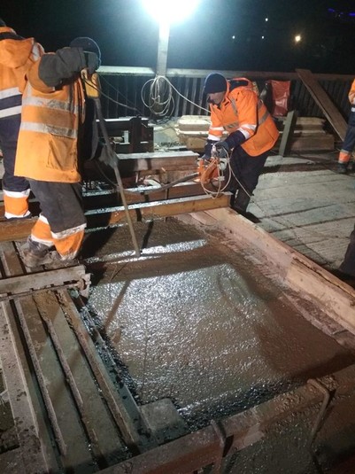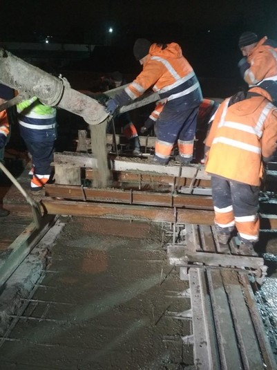 Автодорівці вже виконали роботи з розбирання старого деформаційного шва, встановлення нового та армування плити прогонової будови. Сьогодні вночі було завершено наступний етап – укладання бетону і наразі тривають роботи з догляду за ним.