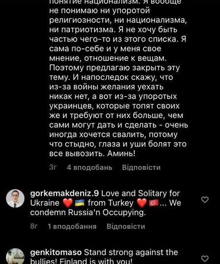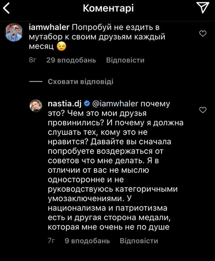 У відповідь користувач спробував пояснити, чому не варто їздити до держави, яка окупувала українські землі та намагається «вигнати нас зі свого дому». Він зазначив, що з квитків на заходи Анастасії збирається податок, за рахунок якого «до Донецька везуть сотні військової техніки».