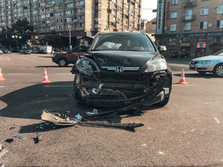 Водій Seat їхав по вулиці Саксаганського. Повертаючи на площу Перемоги, він відчув сильний удар і вилетів на клумбу. В авто спрацювали подушки безпеки, тому водій не постраждав. Honda рухалася по вулиці Дмитрівській в сторону Старовокзальної і влетіла в Seat.