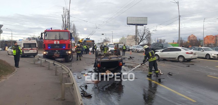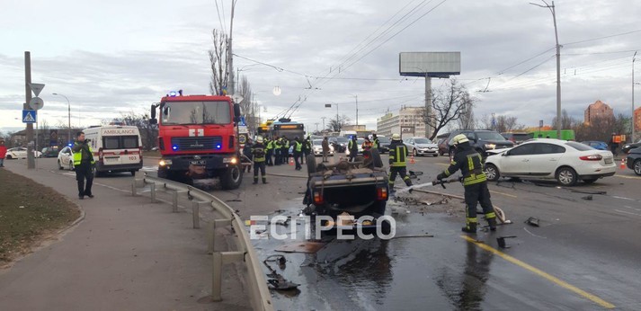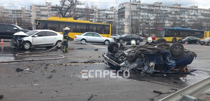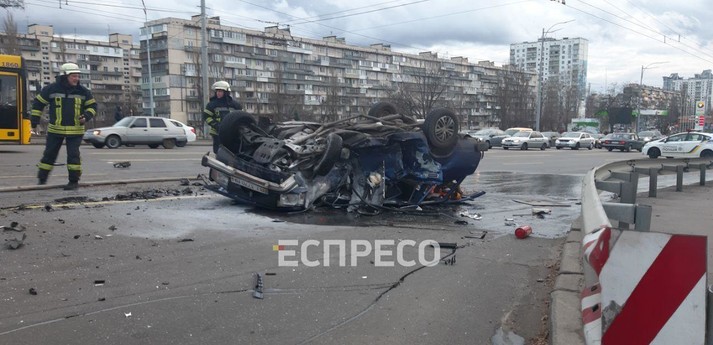 ДТП у Києві. Автомобіль ВАЗ перекинувся і загорівся (відео)