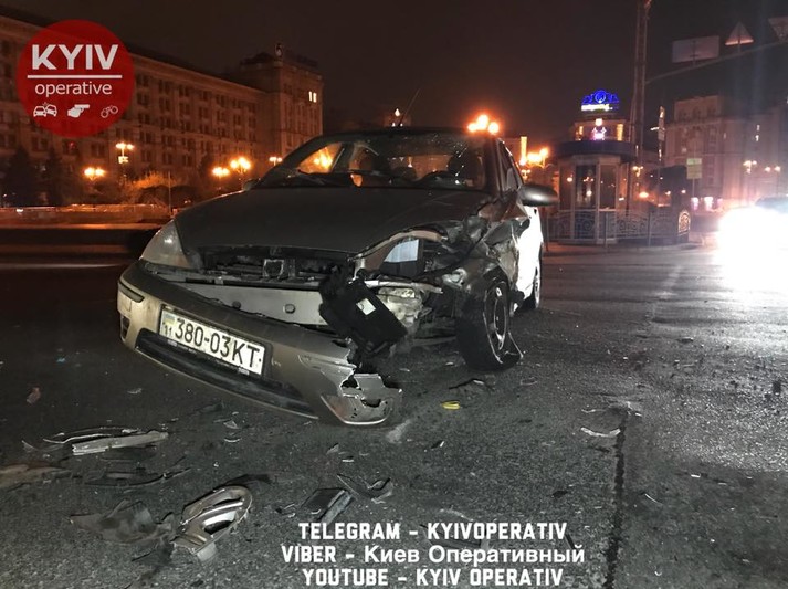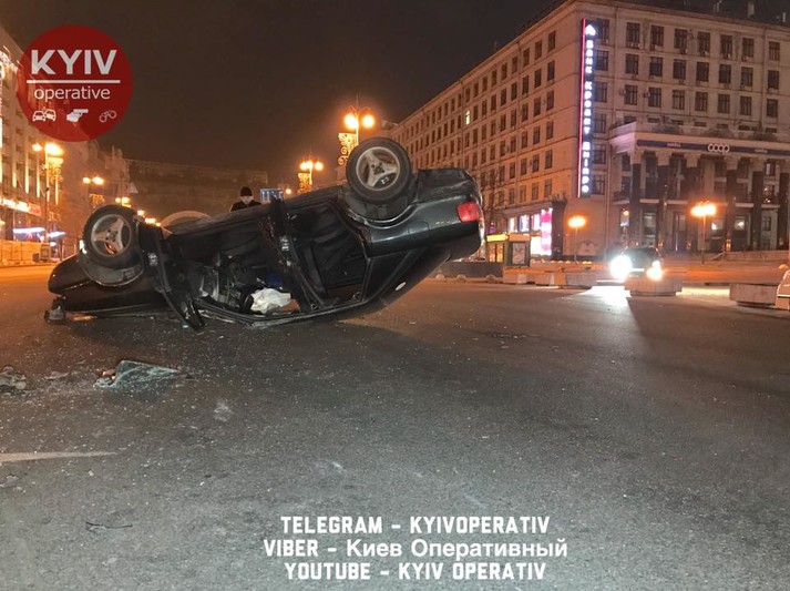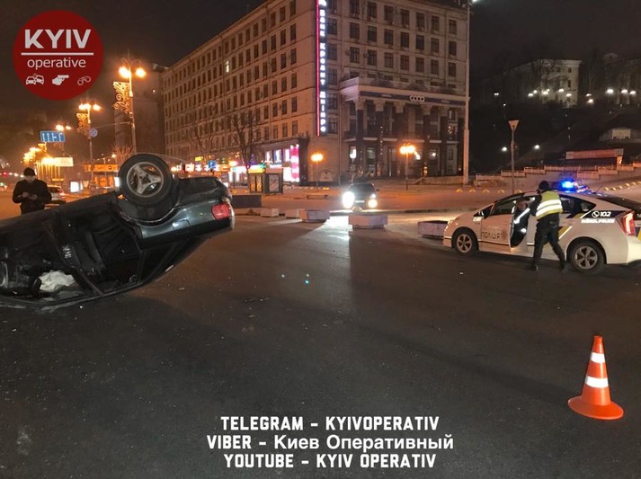 Вночі в Києві на перетині вулиць Хрещатик і Михайлівській сталася масштабна ДТП з перекиданням.