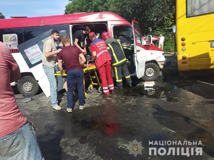 «За попередніми даними, спочатку сталося зіткнення маршрутного автобуса «Мерседес», який, продовжуючи рух по другорядній дорозі, зачепив автомобіль «Шкода». Після чого автотранспорт занесло на головну дорогу, де сталося зіткнення з маршрутним автобусом «Богдан», - повідомили в поліції.