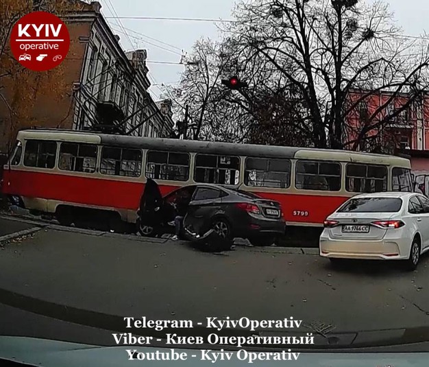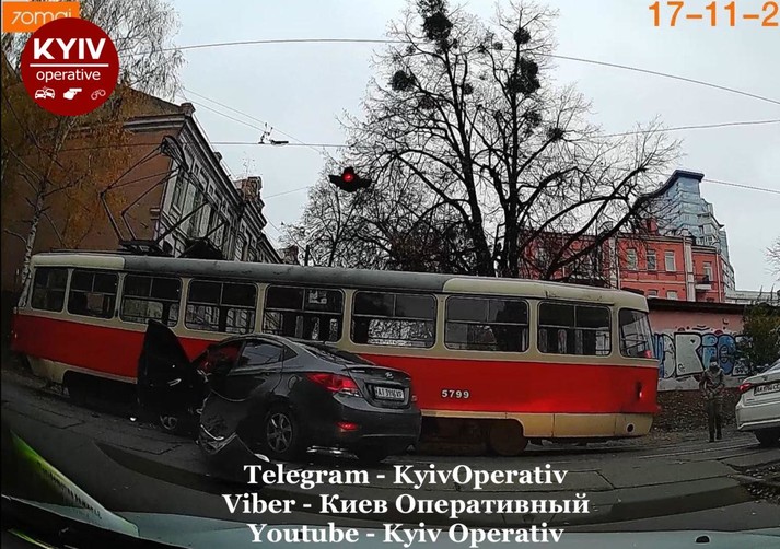 Сьогодні, 17 листопада, на вулиці Дмитрівській у Києві автомобіль Hyundai врізався у трамвай.