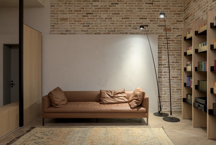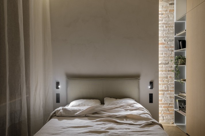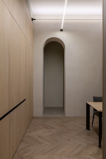 Аби не загромаджувати приміщення, а розмір квартири 98 кв.м, дизайнери вдалися до лаконічності у виборі матеріалів, фактур та кольорів. «Тип оздоблення стін всюди один – тинькування. Це практичне рішення, оскільки покриття зі штукатурки приховане воском і не боїться вологи, каже автор проекту», – зазначається в описі помешкання.