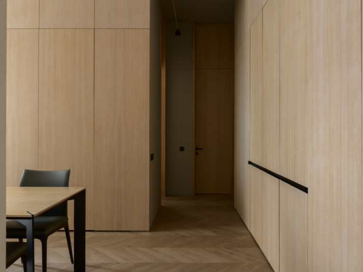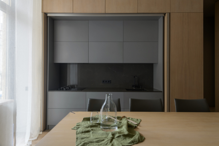 Оскільки будинок доволі старий, стіни не могли перемістити, але прибрали перегородку, яка відділяє коридор з вітальнею, візуально розділивши зони дзеркалом. У кухні встановили спеціальну систему, яка дозволяє закрити робочу поверхню та побутову техніку. Так кухня в будь-який момент може перетворитися в їдальню. До речі, усі меблі у квартирі кольору вибіленого дуба.