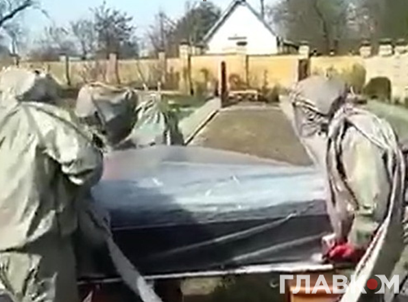 Могилу копали люди в захисних костюмах, схожих на скафандри.