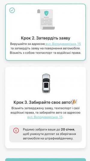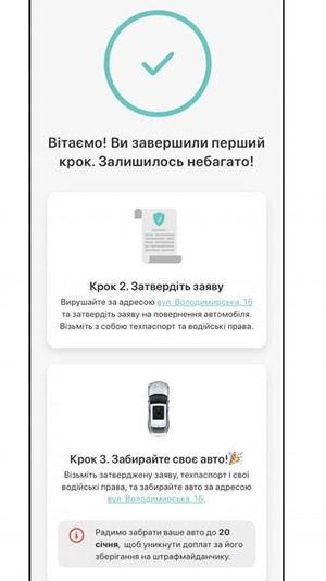 8. Тепер потрібно поїхати затвердити заяву та забрати авто (буде вказано за якою адресою вам треба їхати, аби затвердити заяву, і які документи необхідно мати з собою).