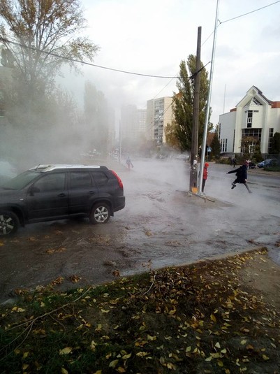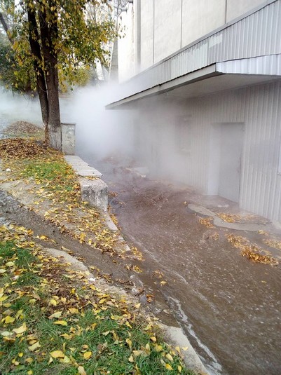 Як видно з фото, від води, що тече вулицею, йде пара, а люди намагаються перестрибнути гарячі струмки.