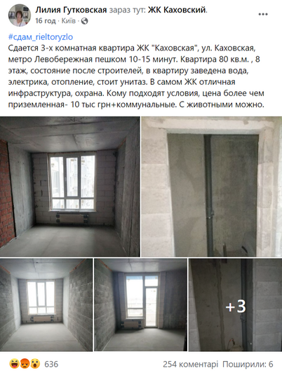 «Задається трикімнатна квартира ЖК «Каховська», вул. Каховська, метро Лівобережна пішки 10-15 хвилин. Квартира 80 кв.м., восьмий поверх, стан після будівельників, у квартиру заведена вода, електрика, опалення, стоїть унітаз», – повідомила авторка оголошення.