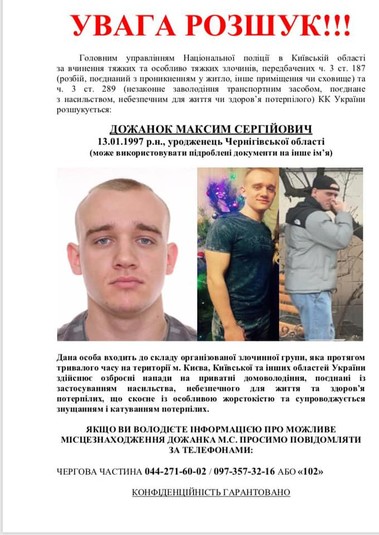 «Якщо ви володієте інформацією про можливе місцезнаходження учасників угруповання, просимо повідомляти за телефонами: чергова частина 044-271-60-02 / 097-357-32-16 або «102». Конфіденційність гарантовано», – закликають правоохоронці.