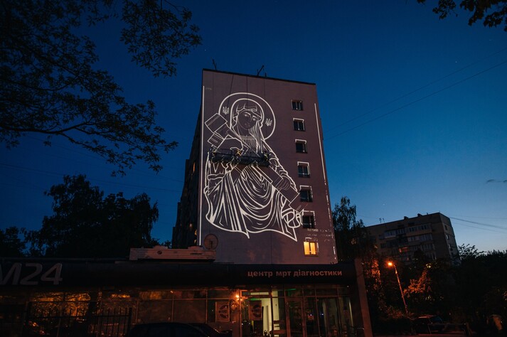 На будівлі зображено Божу Матір, яка тримає в руках ракетний комплекс Javelin