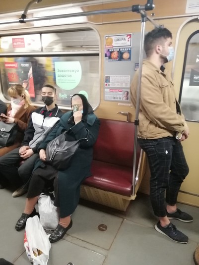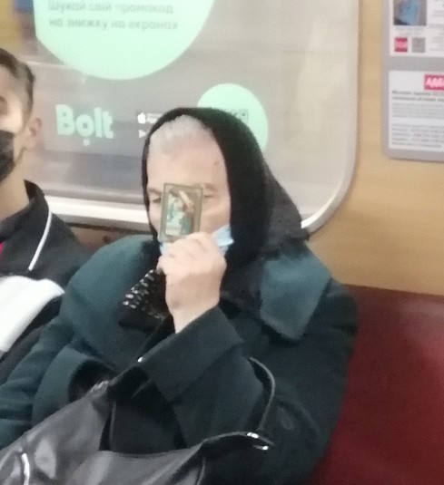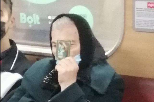 У київському метро бабуся сиділа у вагоні і тримала іконку перед собою у тому місці, де повинна була бути маска. А сам же медичний захист старенька спустила на підборіддя.