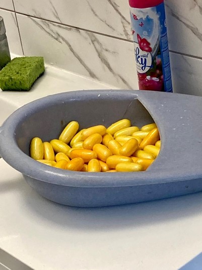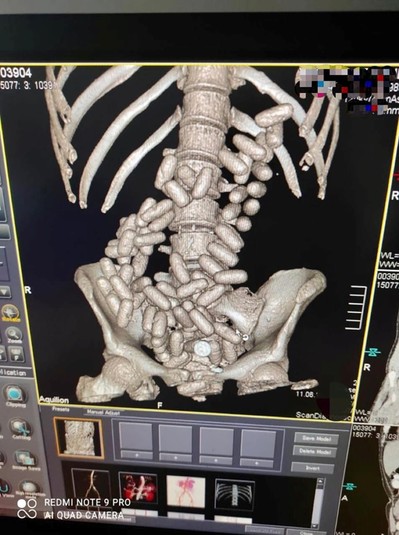 Під час проведення комп'ютерної томографії виявилося, що в його черевної порожнини знаходиться 91 овальна капсула з невідомою речовиною.
