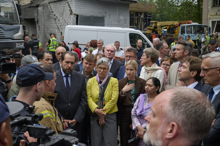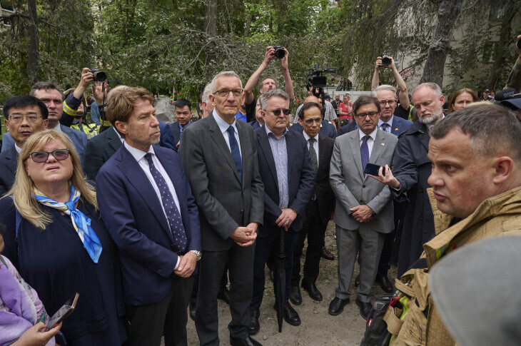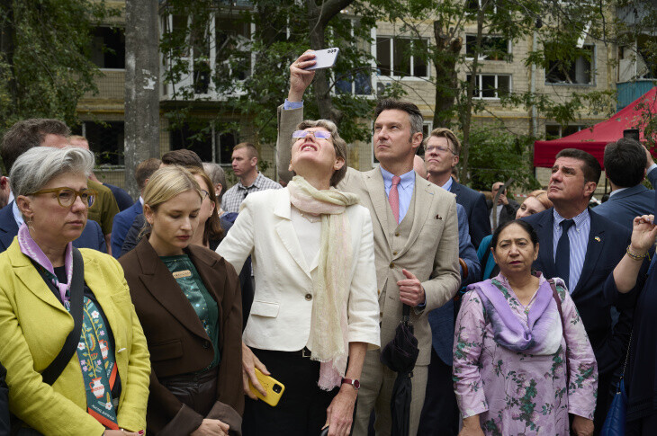 Зазначається, що відвідування іноземним дипкорпусом місця удару відбулося на доручення глави МЗС Андрія Сибіги, щоб іноземні дипломати на власні очі побачили наслідки брутального російського терору. Керівників іноземних дипмісій супроводив перший заступник міністра закордонних справ Сергій Кислиця.