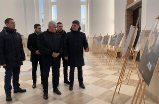 Під час огляду фотовиставки секретар Бучанської міської ради Тарас Шаправський розповів гостю про трагедію, яку пережило місто і громада у період окупації: викрадення, катування та вбивства мирного населення.