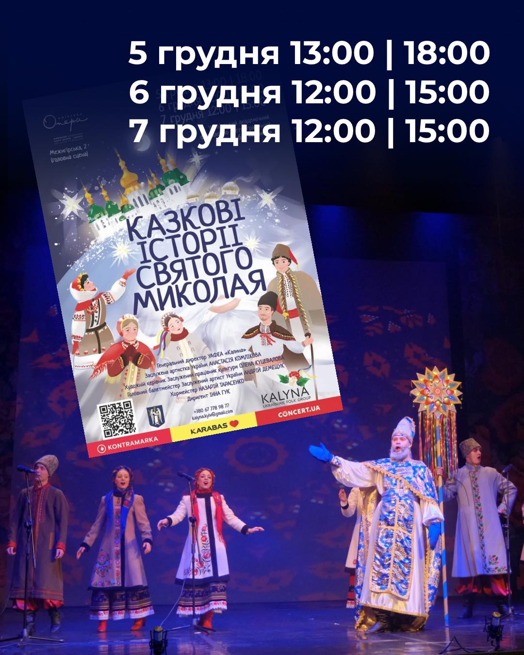 Концертна програма Українського академічного фольклорно-етнографічного ансамблю «Калина» «Казкові історії Святого Миколая» запрошує у цікаву подорож разом зі Святим Миколаєм у чарівний світ української зими зі старовинними традиціями та таємничими пригодами.