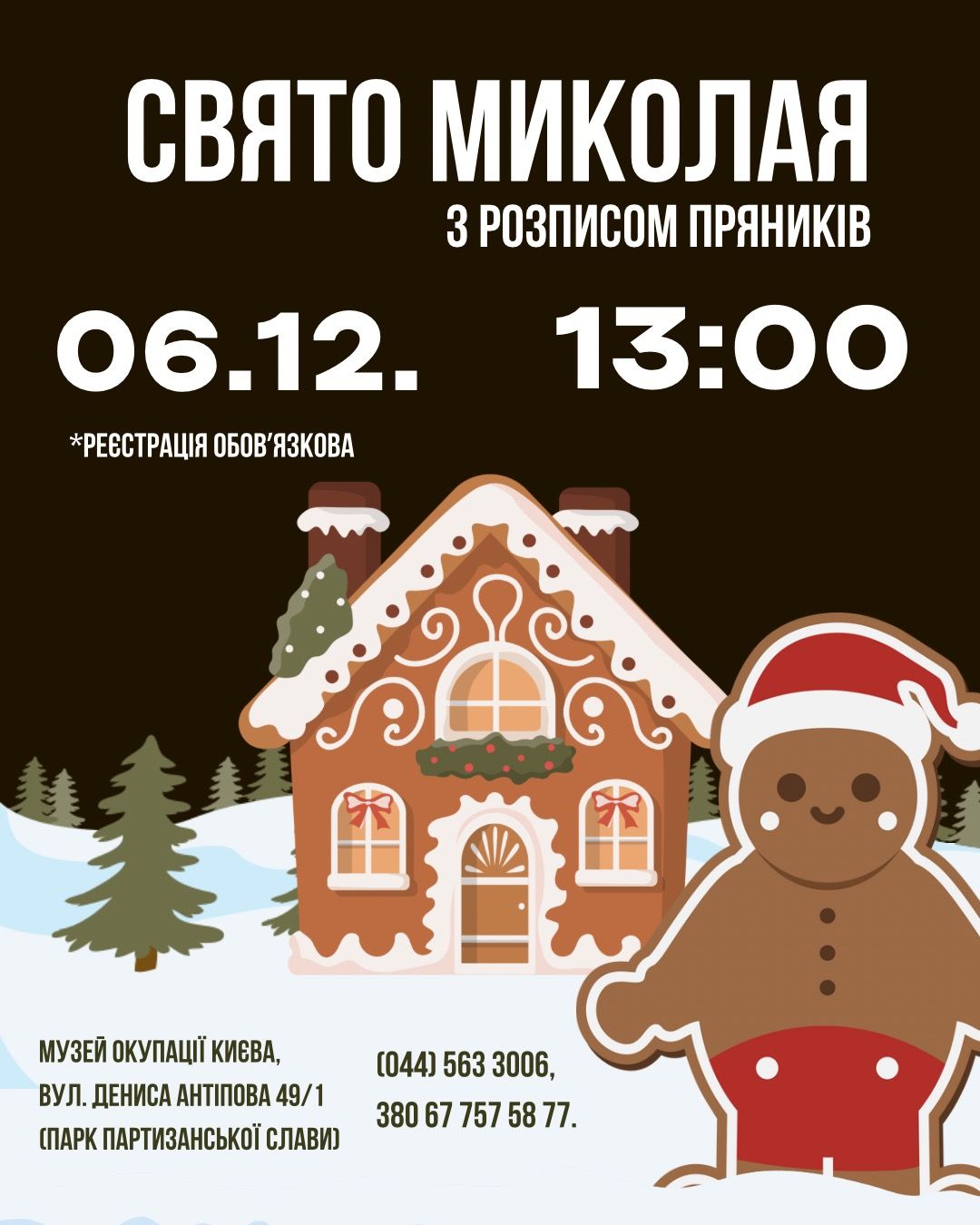 Музей окупації Києва запрошує всіх діток на чарівне святкування Дня Святого Миколая. Діти дізнаються про традиції святкування та вірування у Святого Миколая, а також навчаться власноруч розписувати смачні пряники. Заняття розраховане для діток від шести років. Реєстрація за номером телефону – обовʼязкова.