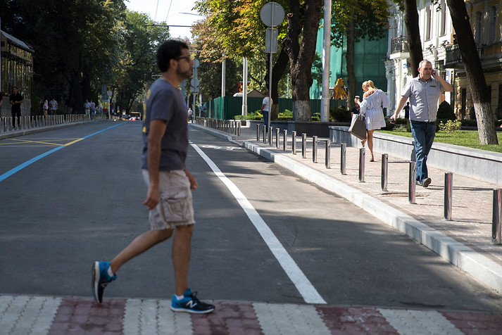 «Тут розширили тротуар до рівня смуги для паркування. Завдяки цьому пішохода, який збирається перейти дорогу, краще видно. Його не закривають припарковані автомобілі. Також завдяки звуженню на перехресті проїжджої частини знижується швидкість автомобілів і, що важливо, водії не зможуть паркуватися прямо на перехресті, - підкреслив Кличко. - Скоро вступає в дію закон про паркування. І, наприклад, тут, на Леонтовича впорядкована зона для паркування автомобільного транспорту. Передбачені місця для паркування автомобілів людей з обмеженими можливостями. Це і є європейський стандарт доріг. І такі дороги мають бути всюди в столиці».