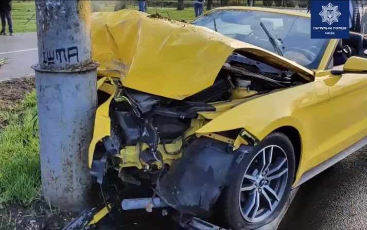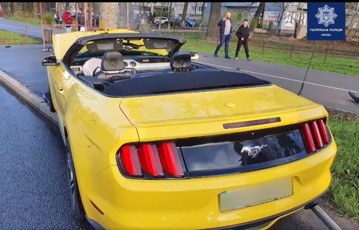 Кабріолет «обійняв» стовп: у Києві Mustang потрапив у ДТП (фото, відео)