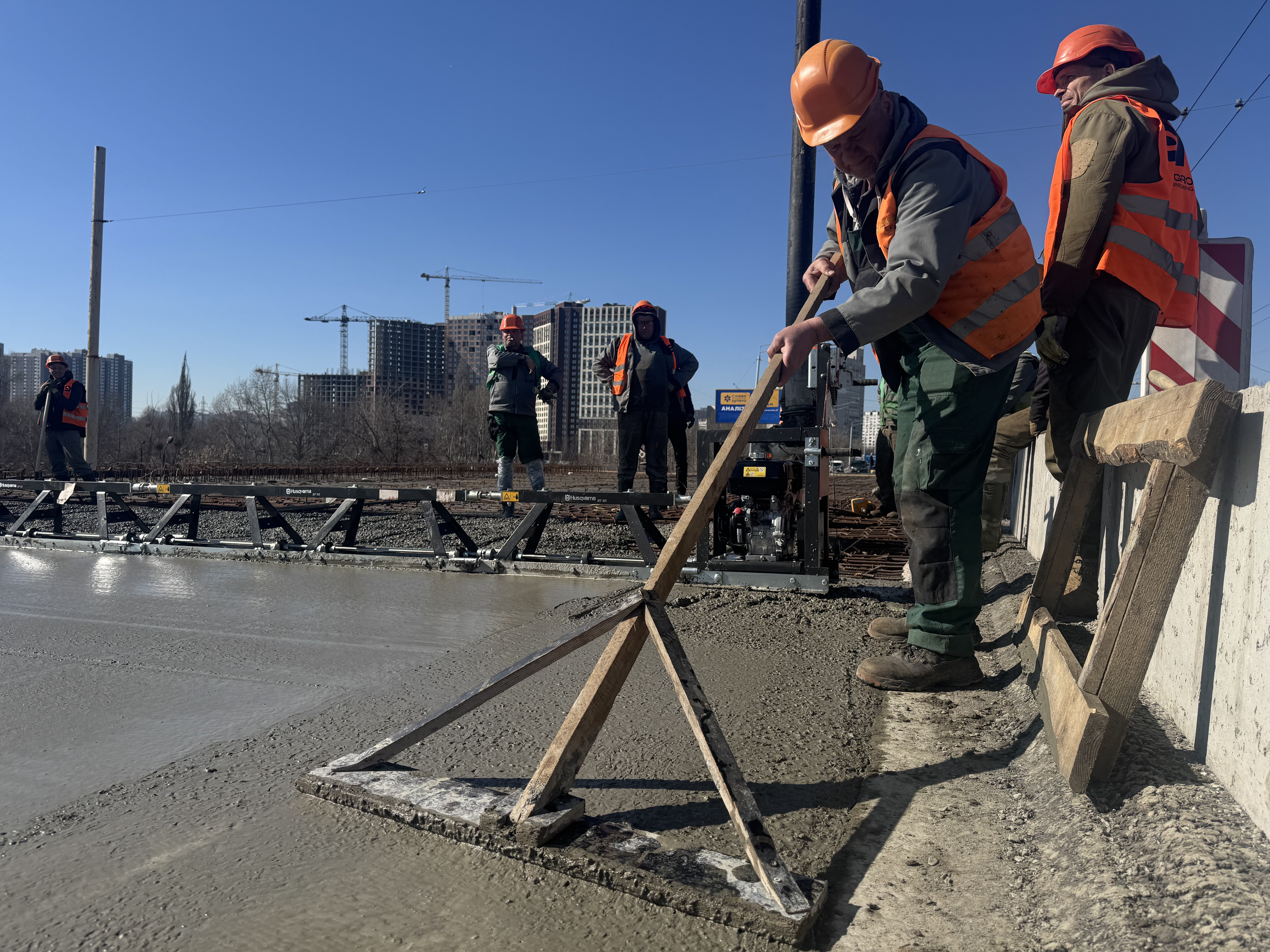 Мостовики вже здійснили армування та бетонування монолітної плити проїжджої частини, наразі влаштовують конуси та тротуар.
