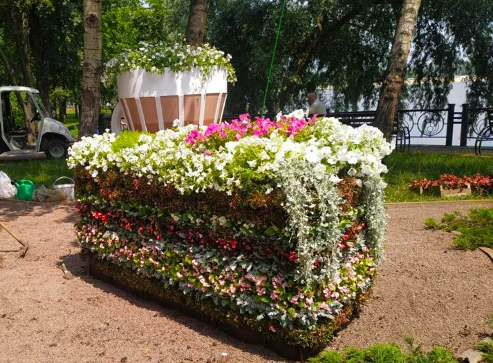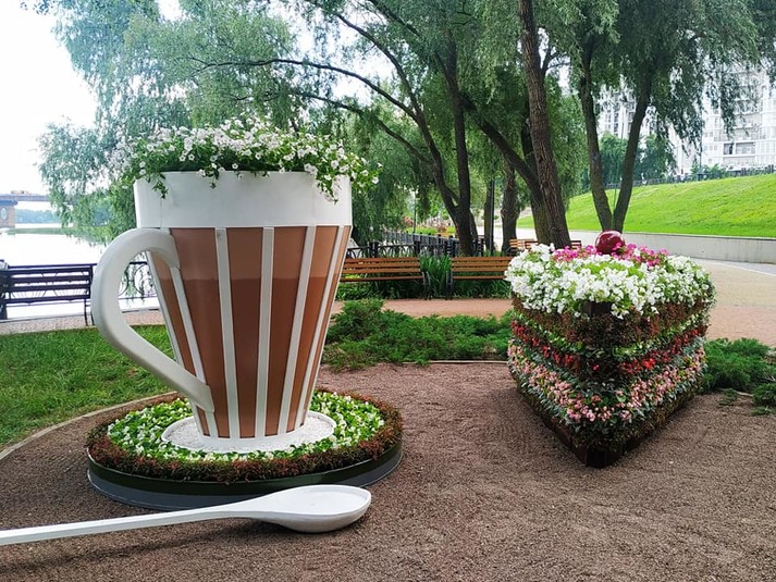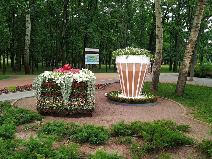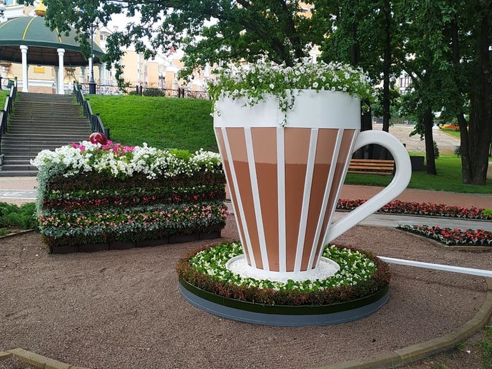 Так, у столичному парку «Наталка» з’явився новий арт-об’єкт – квіткова чашка з кавою і тістечко із квітів.