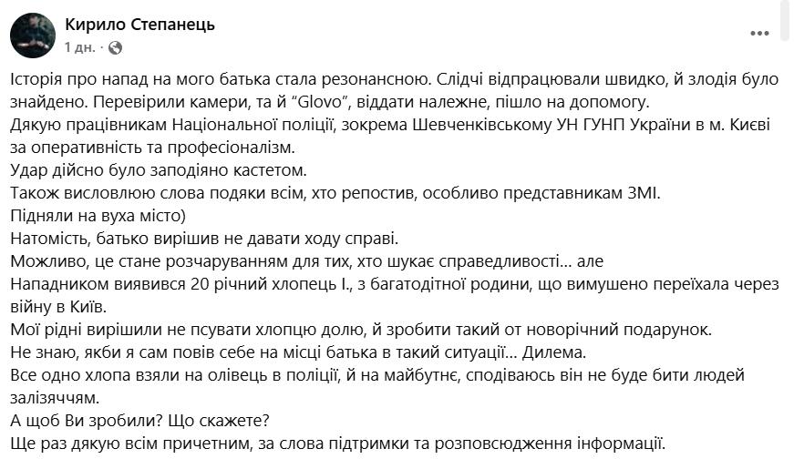 За словами Кирила Степанця, нападником виявився 20-річний хлопець із багатодітної родини внутрішньо переміщених осіб, які переїхали до Києва через війну. Саме цей факт став вирішальним для родини постраждалого – вони вирішили не псувати юнакові майбутнє судимістю.