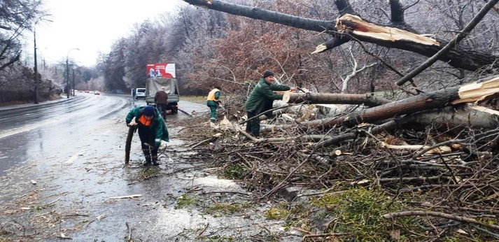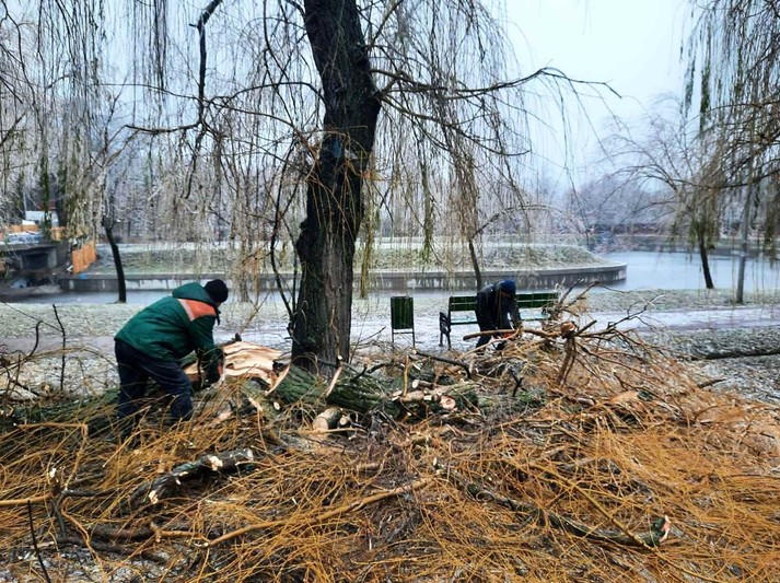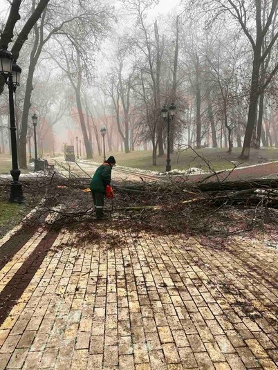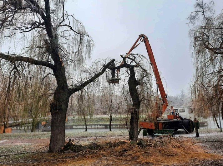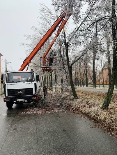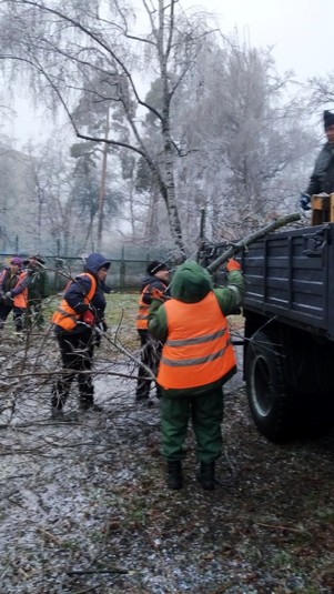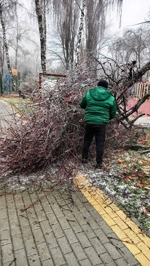 Районні комунальники також продовжують прибирати наслідки негоди на своїх балансових територіях. Вагу криги, що намерзла на гіллях та стовбурах, не витримали понад 600 дерев у парках та скверах: 71 дерево зламано повністю та ще 544 пошкоджені, з обламаним гіллям.