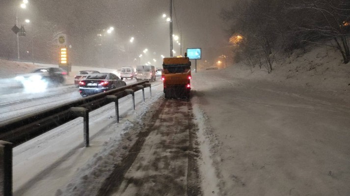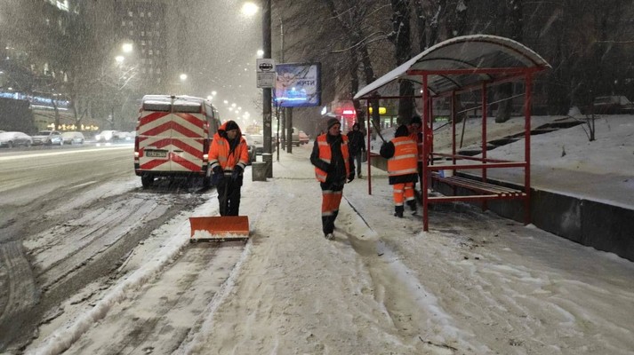 Снігопад у Києві тривав майже всю ніч. Дорожники продовжували обробляти протиожеледними засобами і прибирати від снігу вулиці й тротуари Києва. Про це повідомляє комунальна корпорація «Київавтодор».