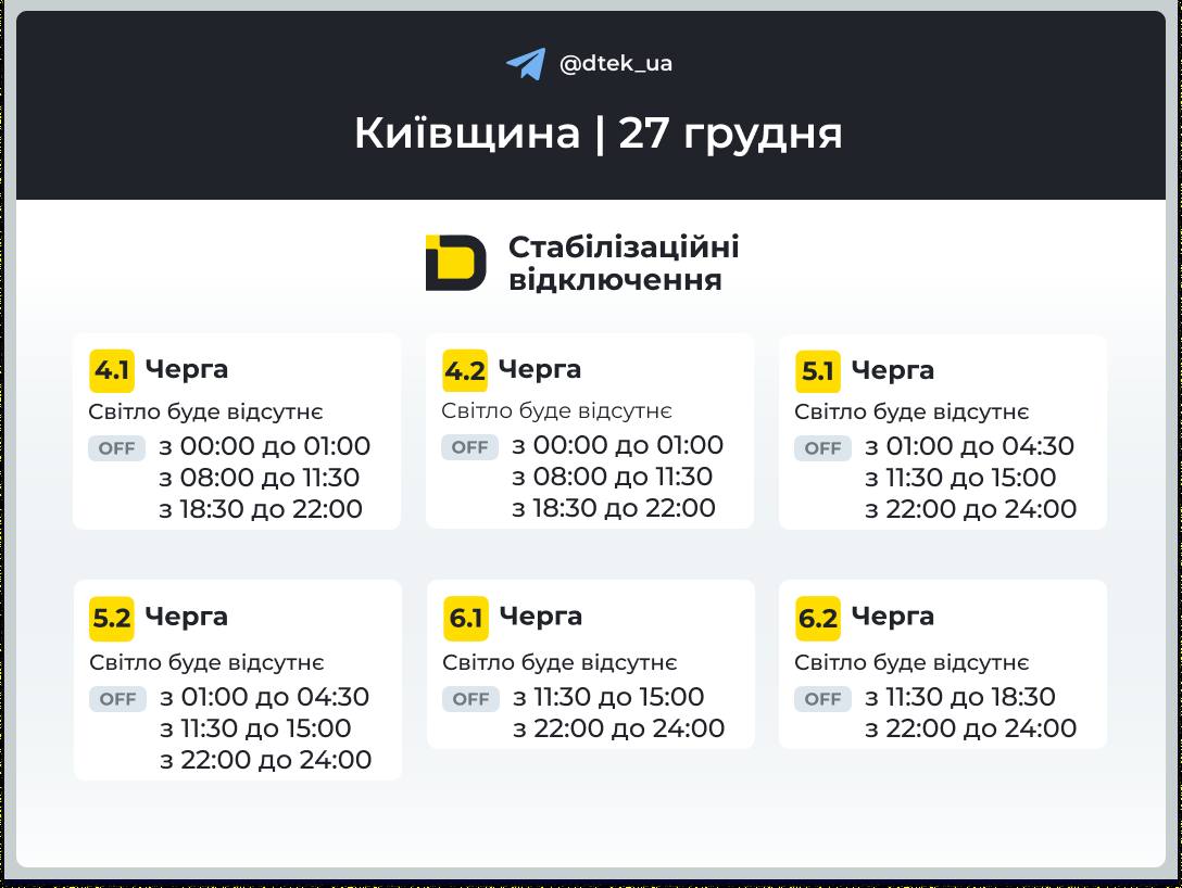 Київщина: графіки відключення світла 27 грудня 2025 року