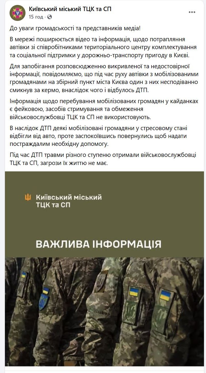 «В мережі поширюється відео та інформація, щодо потрапляння автівки зі співробітниками територіального центру комплектування та соціальної підтримки у дорожньо-транспорту пригоду в Києві. Для запобігання розповсюдженню викривленої та недостовірної інформації, повідомляємо, що під час руху автівки з мобілізованими громадянами на збірний пункт міста Києва один з них несподіванно смикнув за кермо, внаслідок чого і відбулось ДТП», – повідомили в центрі.