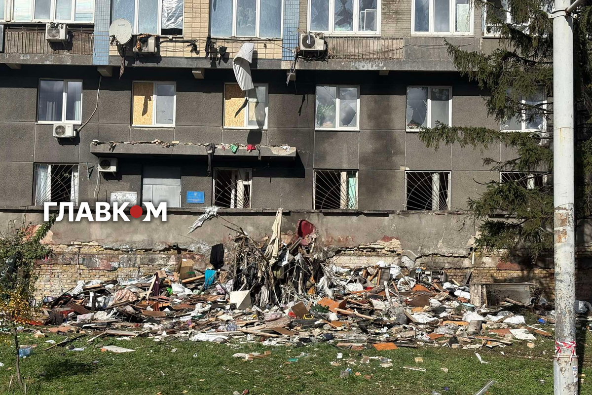 Після нічної атаки РФ на столицю, у ніч на 10 жовтня, понівечений будинок поступово розчищають комунальники та місцеві мешканці і фіксують наслідки. Кіптява на стінах, вибиті вікна та понівечені квартири – так виглядає результат російської атаки на Київ. «Главком» показує наслідки влучання дрона.
