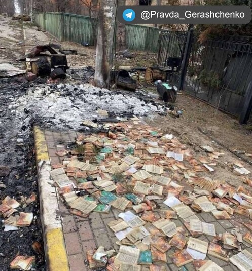 У Ірпені російські військові влаштували акт вандалізму та спалили сотні примірників Біблії. Книги просто винесли просто неба й підпалили. Деякі примірники не встигли згоріти у вогні й залишилися лежати на землі.