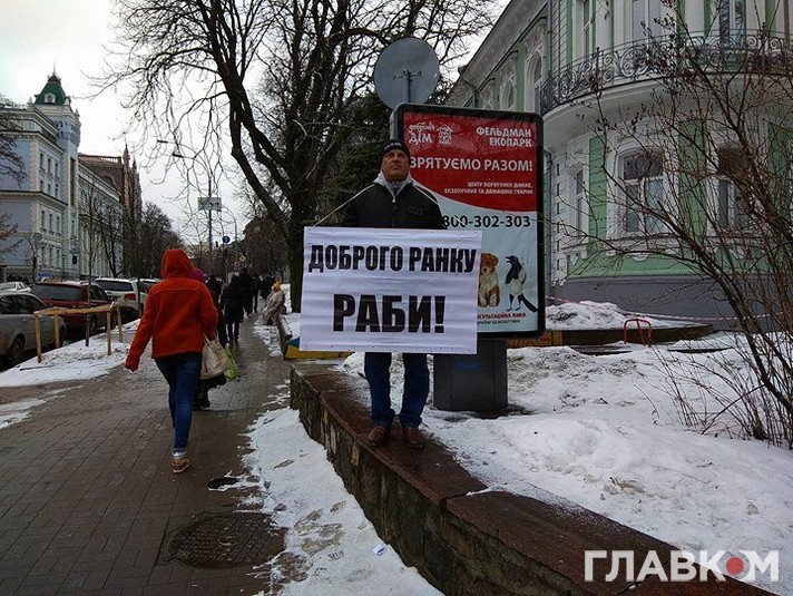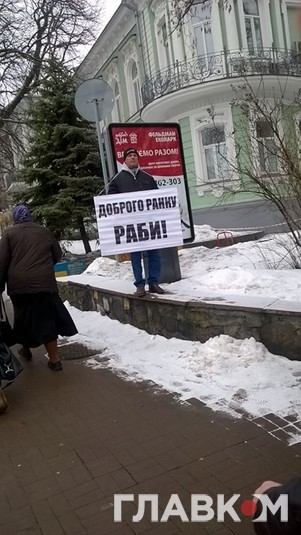 Як повідомляє кореспондент «Главкома», людей, які вранці поспішають на роботу, зустрічає чоловік з плакатом, на якому написано «Доброго ранку, раби!».
