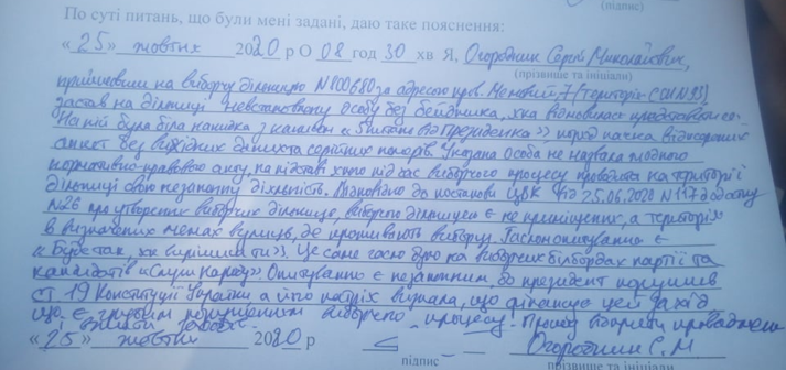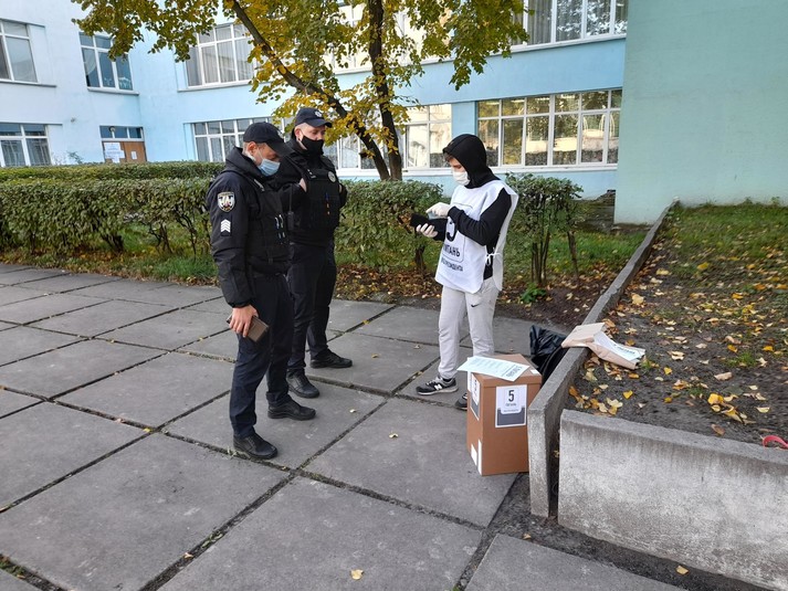 «Викликав патрульну. Прийняли заяву, відібрали пояснення. Поширювача з території школи прогнали. Сказала поліція, що в них ще таких 10 викликів», – зазначає журналіст руху «Чесно» Сергій Огородник, який голосував на Виноградарі.