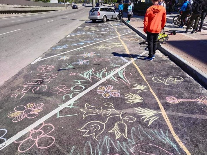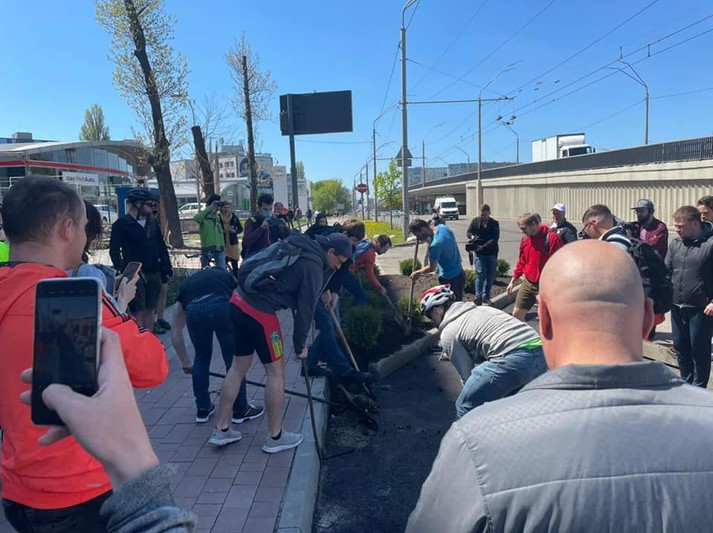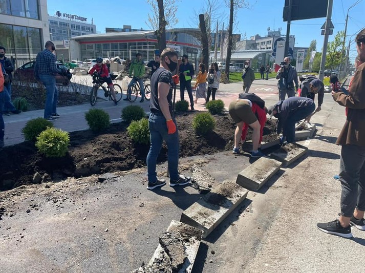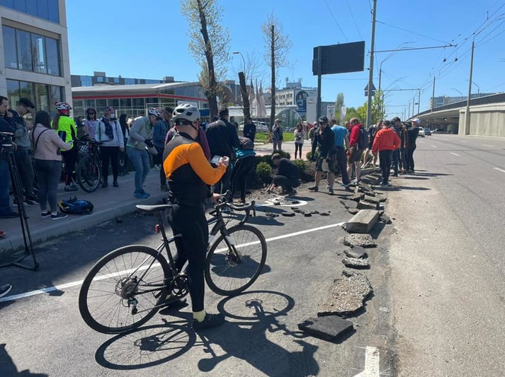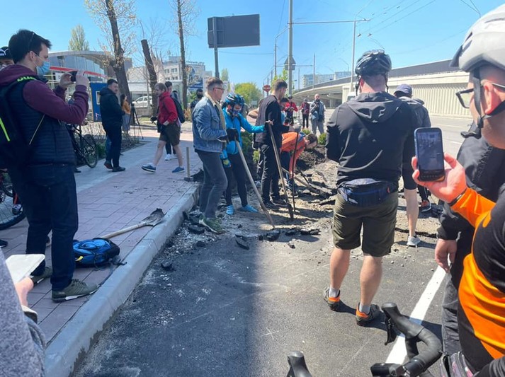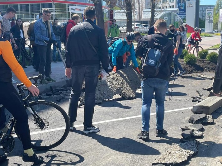 Кілька десятків велосипедистів, озброївшись ломами, лопатами та іншим будівельним спорядженням, повиймали бордюри та виламали асфальт та розмалювали крейдою, щоб нагадати, що тут був газон та велосипедна доріжка.