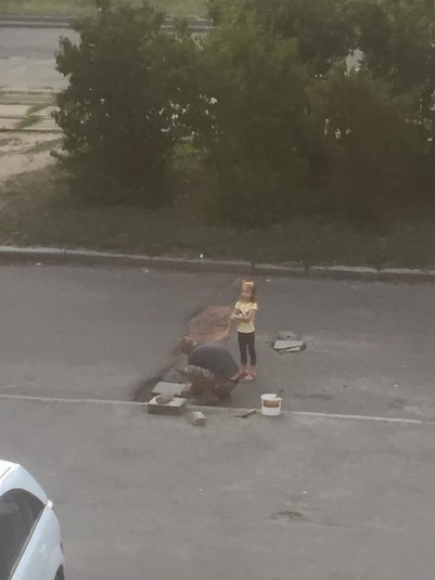 На фото видно, що для ремонту великої і глибокої ями чоловік використав цеглу та цемент.