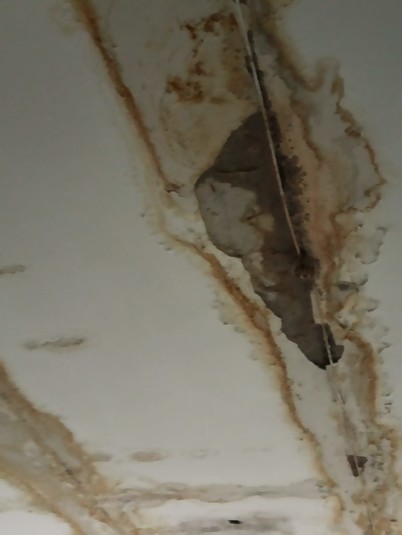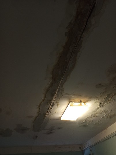 Стеля в медичному закладі в жовтих плямах від води, відвалюється штукатурка.