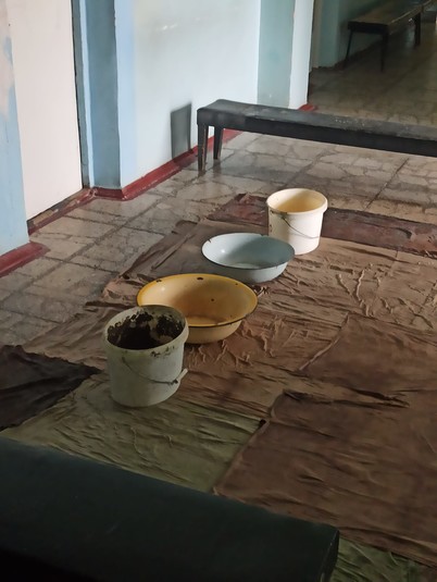 На одному з фото видно, як підлога в закладі встелена рушниками для вбирання води. Зі стелі капає вода, тому вирішили підставити тазики й відра.