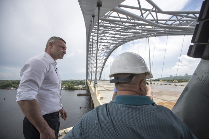 «Хочу наголосити, коли ми говоримо про цей об’єкт, то йдеться не тільки про міст через Дніпро, а про комплекс мостів, естакад і тунелів, що сполучать Поділ і Воскресенський масив. Ми вже на фінальній стадії будівництва. Зокрема, спорудили: естакаду на Рибальському півострові, з’їзд з Подільського мостового переходу на Набережно-Рибальську, міст через Дніпро, естакаду на Трухановому острові, міст через Десенку, естакаду в урочищі Горбачиха, заїзд на Подільський мостовий перехід з Набережно-Хрещатицької. Також вже повністю натягнуті ванти арочної конструкції мосту. І починають процес демонтажу нижніх тимчасових опор», – наголосив Кличко.
