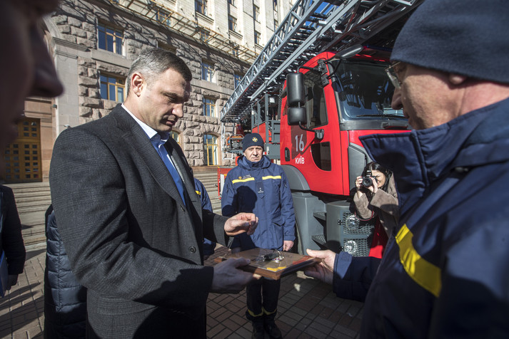 «Сьогодні ми передаємо київському гарнізону 3 сучасних телескопічних підіймачі для роботи на висоті, аварійно-рятувальний автомобіль та 22 комплекти дихальних апаратів. А також - ще два спецавто, що придбані за кошти Держбюджету», - розповів Віталій Кличко.